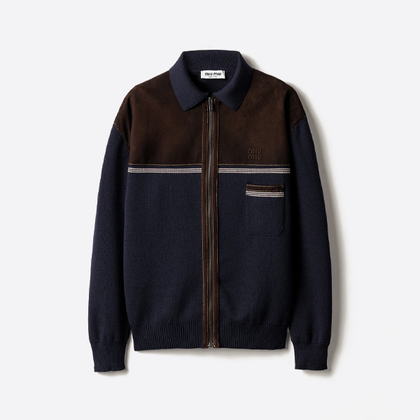 ミュウミュウの襟付きレザーパッチワークニットカーディガン > ★ アウター